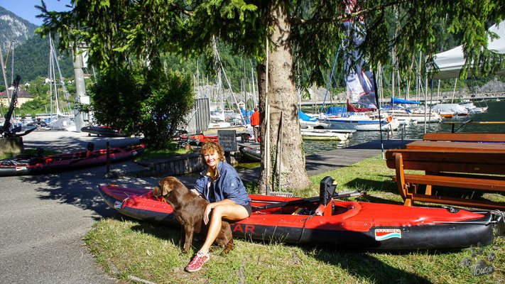 Jaron bekommt ein Brustgeschirr und wird am Tisch festgebunden. Wenn einmal scharf gebremst werden muss, wird er allerdings vorgeschleudert – bis an unsere Sitze. Er hat daraus gelernt und legt sich – mit Geschirr – ganz gerne in unser „Badezimmer“. Da ist es schön eng und kuschelig - und die Wand verhindert ein Rutschen.